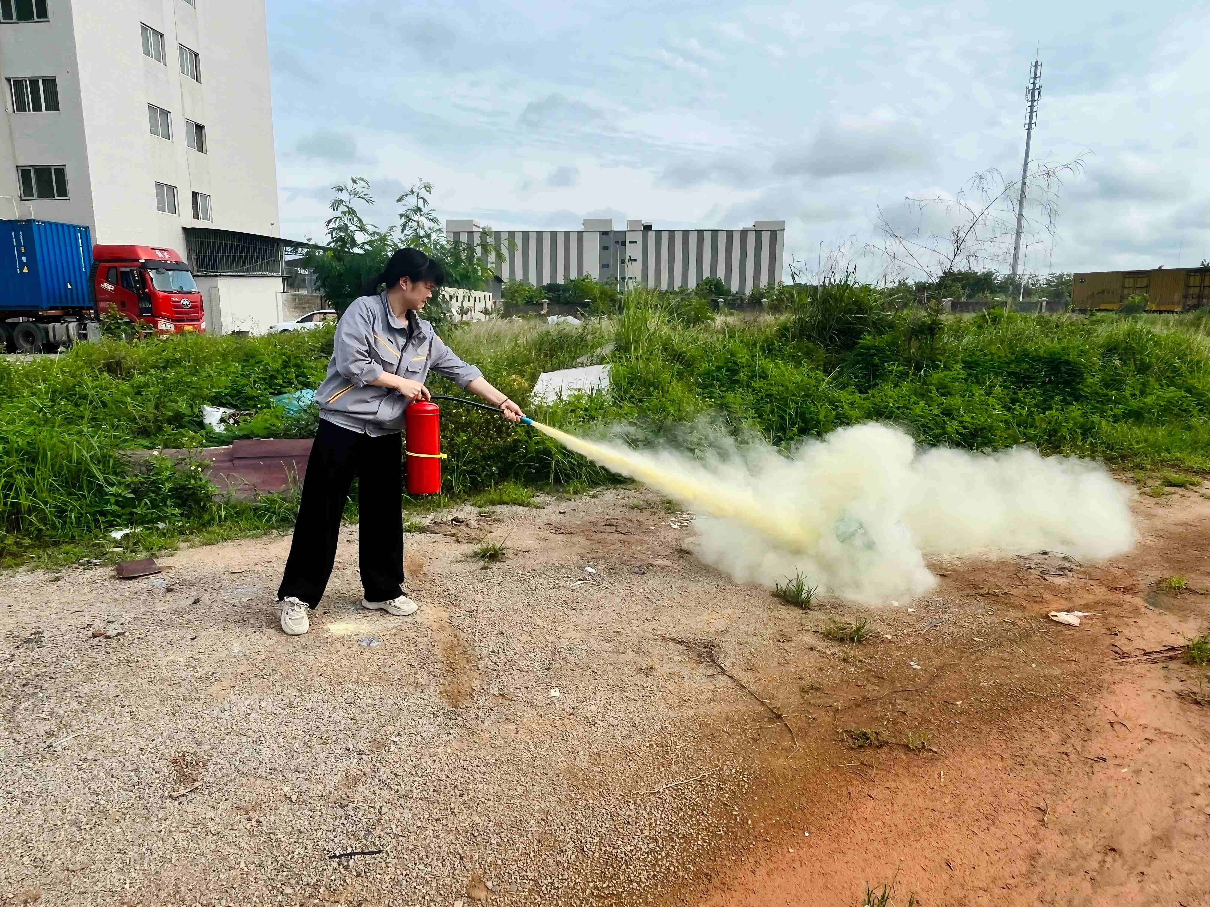 在疏散小組的指揮下,全體員工迅速、有序地撤離到倉(cāng)庫(kù)外物流園一樓的空地上。整個(gè)疏散過(guò)程緊張有序,達(dá)到了預(yù)期效果。在實(shí)操技能體驗(yàn)環(huán)節(jié),采用了互動(dòng)式體驗(yàn)的方式,由質(zhì)量部介紹滅火器的種類(lèi)、適用范圍和正確使用方法以及消防面罩的結(jié)構(gòu)、功能及佩戴方法。員工們輪流操作干粉滅火器,成功撲滅模擬火源,確保每位職工都能掌握基礎(chǔ)消防器材的使用技巧。