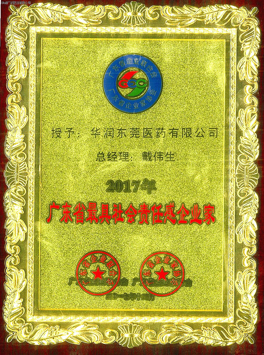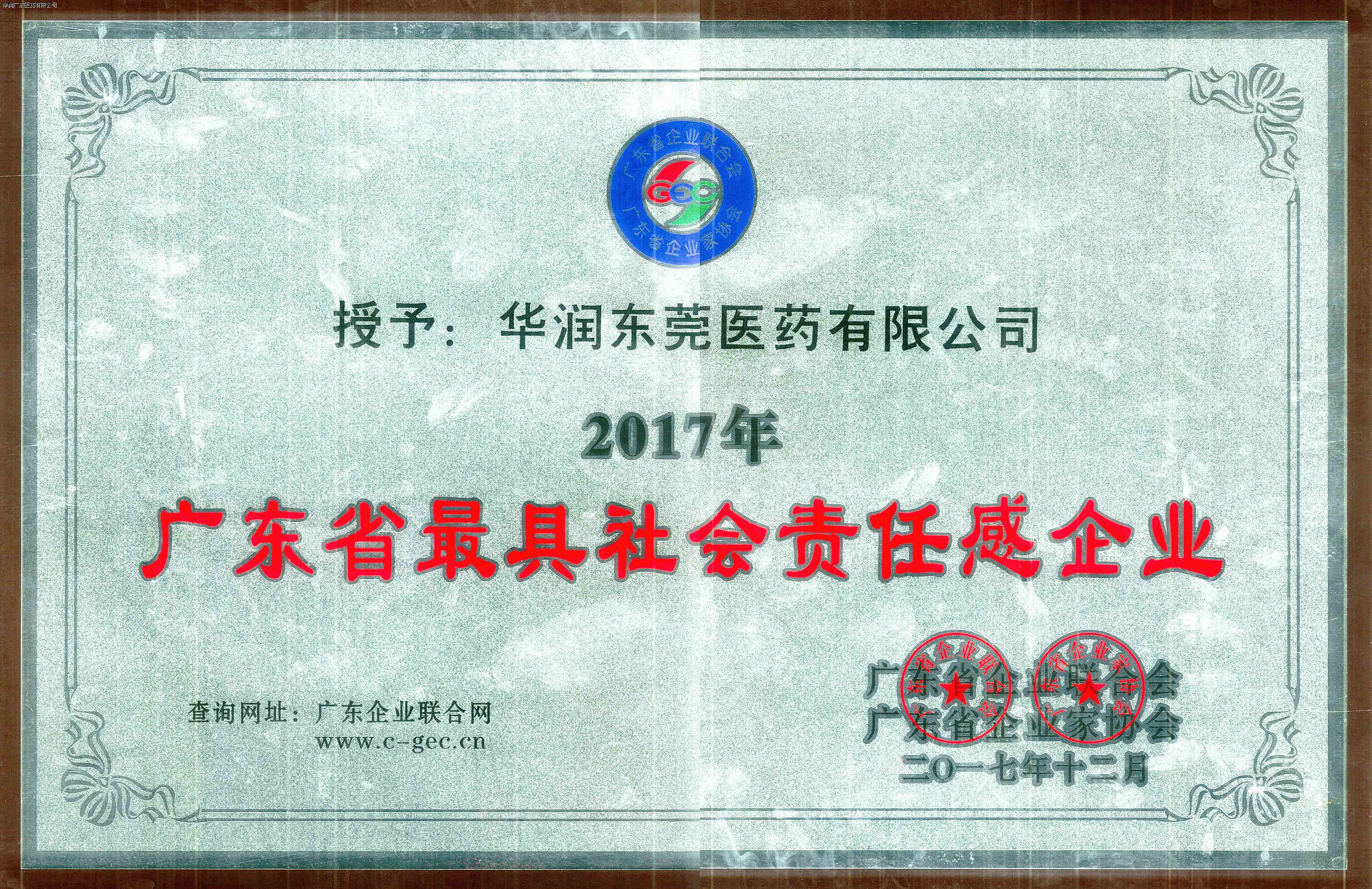 2017年12月21日,由廣東省企業(yè)聯(lián)合會、廣東省企業(yè)家協(xié)會主辦的“2017廣東企業(yè)家年會”在廣州隆重舉行。年會以“新時代 新責任 新征程”為主題,號召全省企業(yè)家以黨的十九大精神為指引,立足新時代,凝聚新力量,開啟新征程。全省企業(yè)家代表、部分行業(yè)協(xié)會商會、各地企聯(lián)負責人約600人出席了會議。華潤東莞醫(yī)藥有限公司(以下簡稱“華潤東莞醫(yī)藥”)榮獲“2017年廣東省最具社會責任感企業(yè)”稱號,公司總經(jīng)理戴偉生先生榮獲“2017年廣東省最具社會責任感企業(yè)家”稱號。